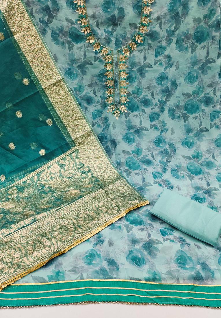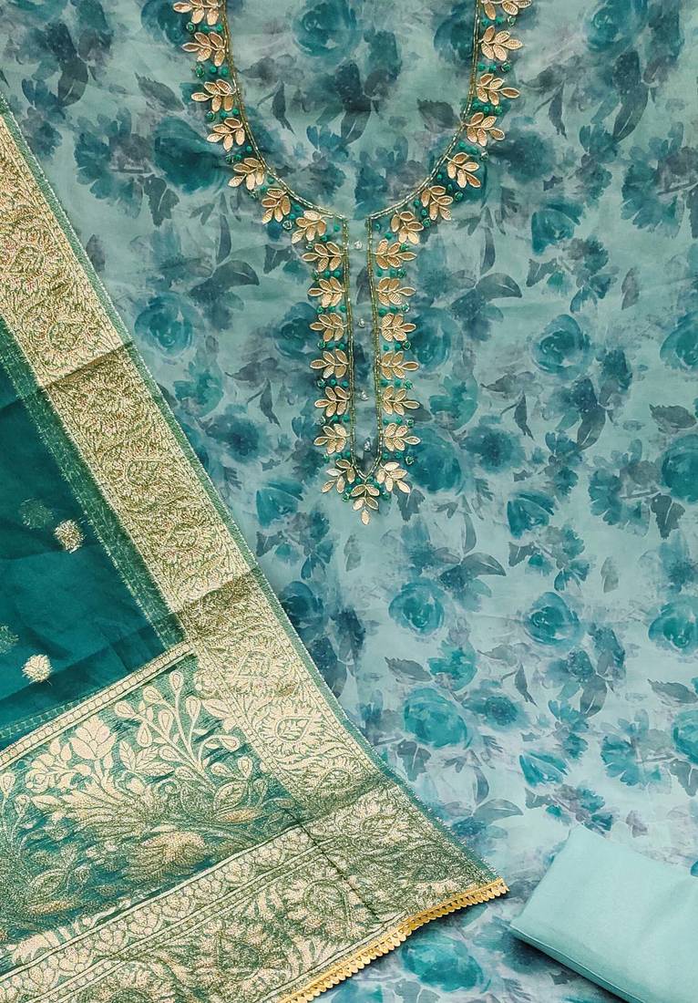 | Product Description | Handwork Digital Print And Fancy Border With Banarasi Woven Dupatta Straight Style 1.90 Mtr Unstitched Dress Material Top Of Multi Colour Organza Fabric With 2 Mtr Santoon As Lining Inner Fabric Also Including 2.10 Mtr Unstitched Bottom Material Of Sea Green Colour Santoon Fabric With 2.00 Mtr Dupatta Of Green Colour Organza Banarasi Fabric |