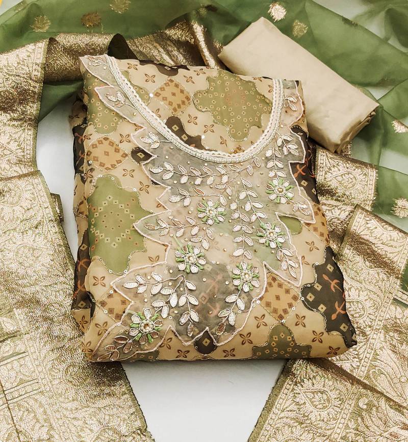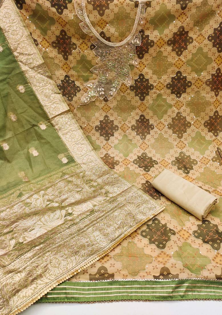 | Product Description | Charming Handwork Thread Sequin Work Position Print And Fancy Border With Banarasi Woven Dupatta Straight Style 1.90 Mtr Unstitched Dress Material Top Of Multi Colour Organza Fabric With 2 Mtr Santoon As Lining Inner Fabric Also Including 2.10 Mtr Unstitched Bottom Material Of Beige Colour Santoon Fabric With 2.00 Mtr Dupatta Of Green Colour Organza Banarasi Fabric |