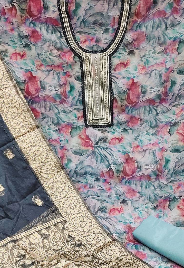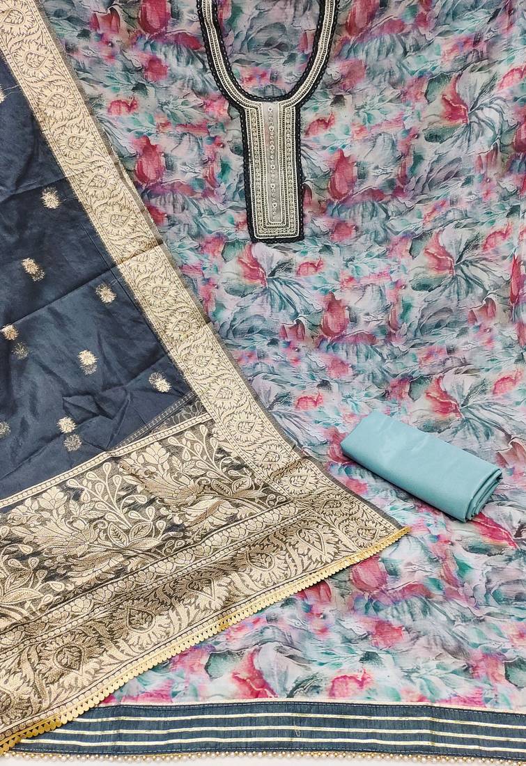 | Product Description | Handwork Digital Print And Fancy Border With Banarasi Woven Dupatta Straight Style 1.90 Mtr Unstitched Dress Material Top Of Multi Colour Organza Fabric With 2 Mtr Santoon As Lining Inner Fabric Also Including 2.10 Mtr Unstitched Bottom Material Of Sea Green Colour Santoon Fabric With 2.00 Mtr Dupatta Of Grey Colour Organza Banarasi Fabric |