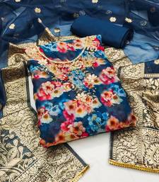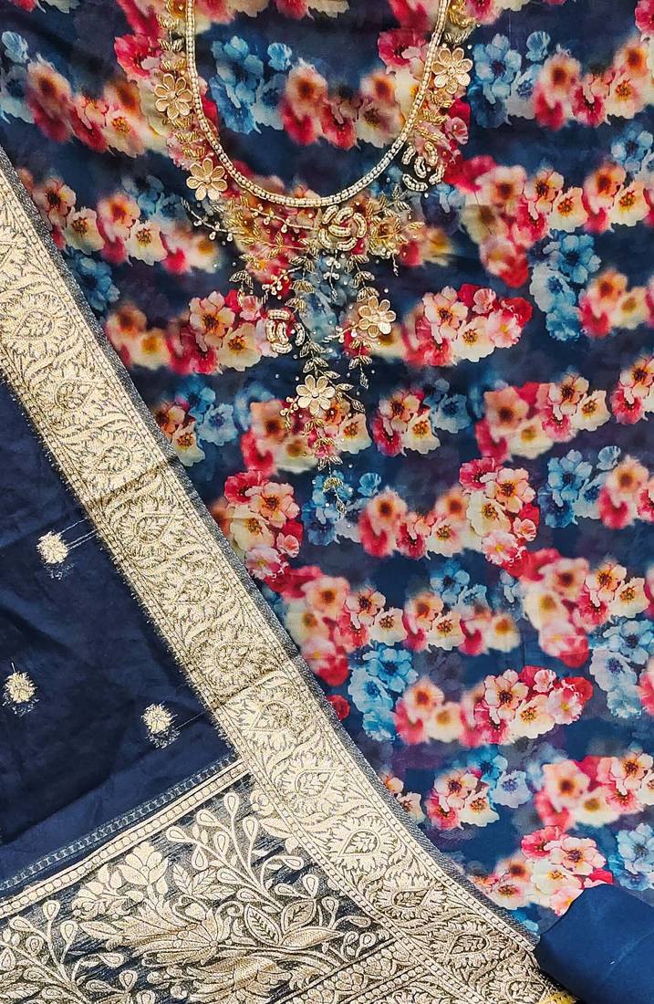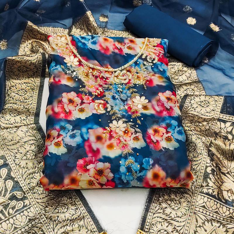 | Product Description | Handwork Digital Print And Fancy Border With Banarasi Woven Dupatta Straight Style 1.90 Mtr Unstitched Dress Material Top Of Multi Colour Organza Fabric With 2 Mtr Santoon As Lining Inner Fabric Also Including 2.10 Mtr Unstitched Bottom Material Of Blue Colour Santoon Fabric With 2.00 Mtr Dupatta Of Blue Colour Organza Banarasi Fabric |
