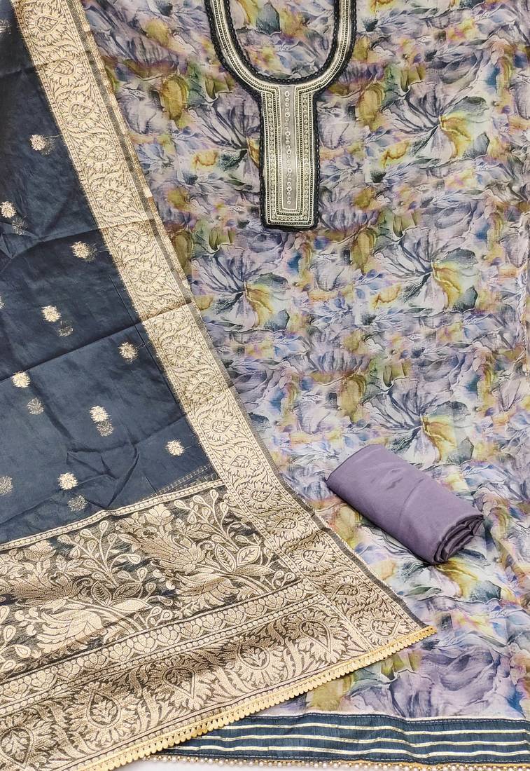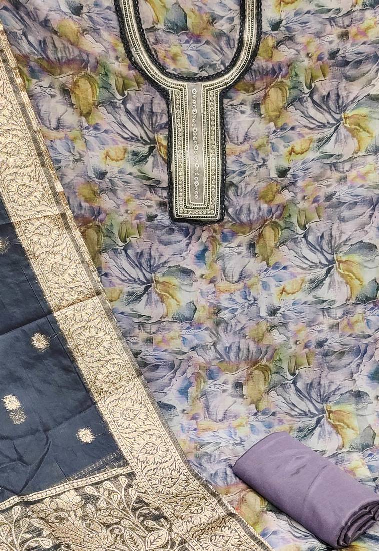 | Product Description | Charming Handwork Digital Print And Fancy Border With Banarasi Woven Dupatta Straight Style 1.90 Mtr Unstitched Dress Material Top Of Multi Colour Organza Fabric With 2 Mtr Santoon As Lining Inner Fabric Also Including 2.10 Mtr Unstitched Bottom Material Of Grey Colour Santoon Fabric With 2.00 Mtr Dupatta Of Grey Colour Organza Banarasi Fabric |