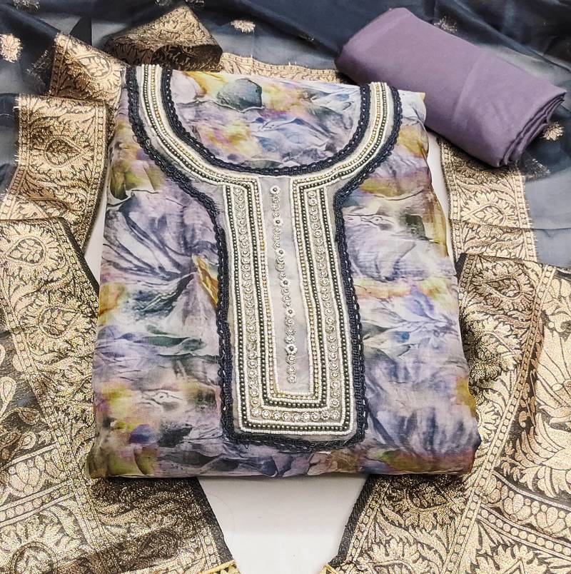Multicolor organza hand embroidery dress material unstitched