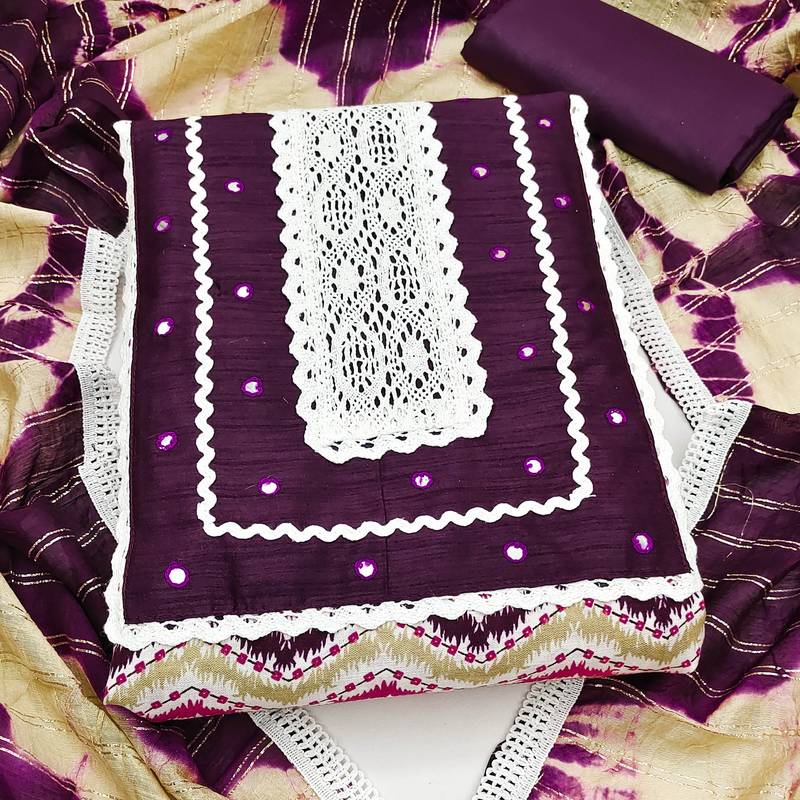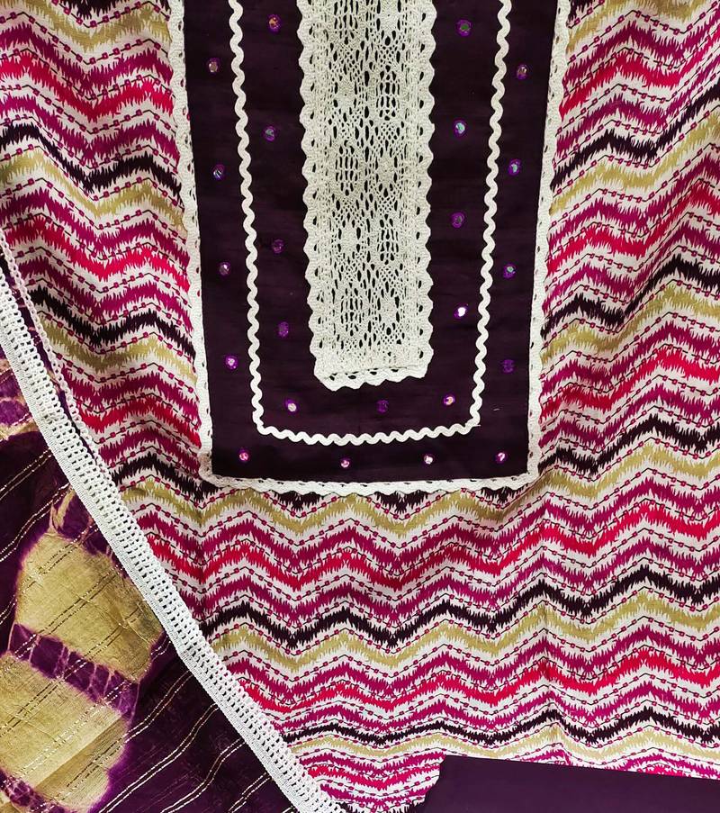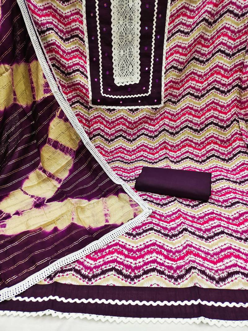 | Product Description | Print And Mirror Work With Fancy Border Straight Style 1.90 Mtr Unstitched Dress Material Top Of Multi Colour Cotton Fabric Also Including 2.10 Mtr Unstitched Bottom Material Of Purple Colour Cotton Fabric With 2.00 Mtr Dupatta Of Multi Colour Cotton Fabric |