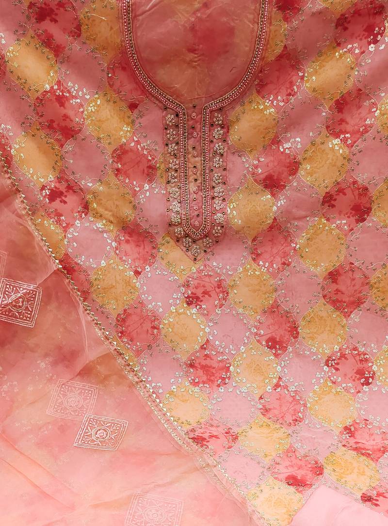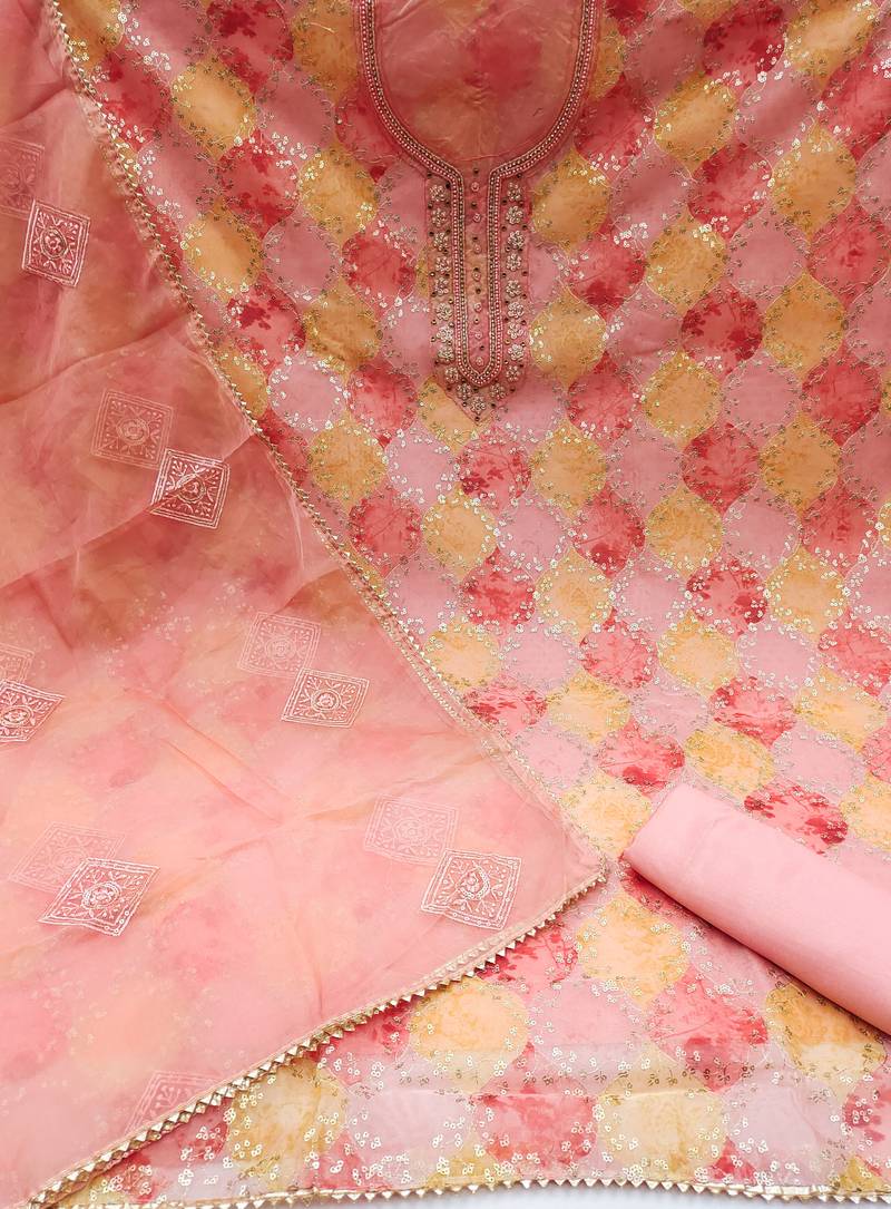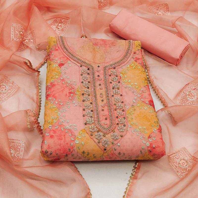 Heavy Sequin And Hand Work Along With Fancy Position Print Work And Embrodiered Dupatta Work Straight Style 1.95 Mtr Unstitched Dress Material Top Of Multi Colour Pure Organza Fabric With 2 Mtr Santoon As Lining Inner Fabric Also Including 3.80 Mtr Unstitched Bottom Material Of Peach Colour Santoon Fabric With 2.05 Mtr Dupatta Of Peach Colour Organza Fabric