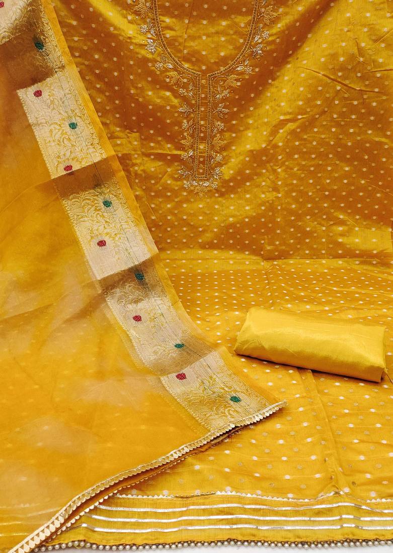 | Product Description | Fancy Hand Work And Weaving With Fancy Printed Dupatta Straight Style 1.95 Mtr Unstitched Dress Material Top Of Mustard Colour Modal Cotton Fabric With 2 Mtr Santoon As Lining Inner Fabric Also Including 3.80 Mtr Unstitched Bottom Material Of Mustard Colour Santoon Fabric With 2.05 Mtr Dupatta Of Multi Colour Organza Fabric |