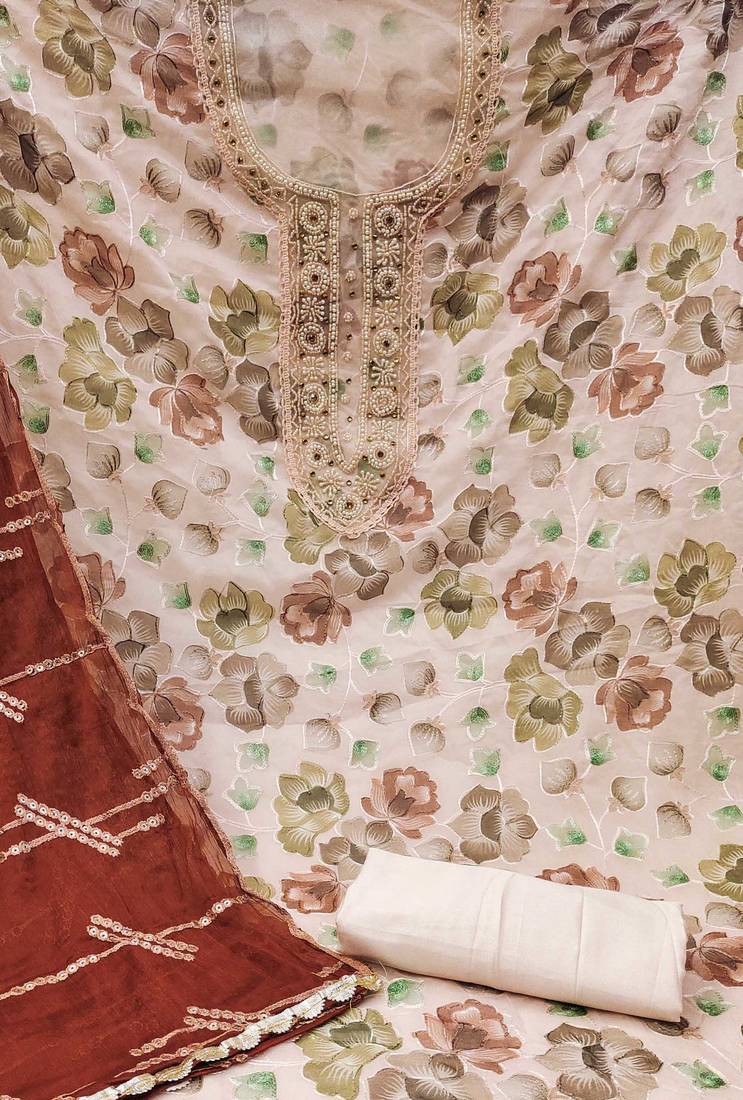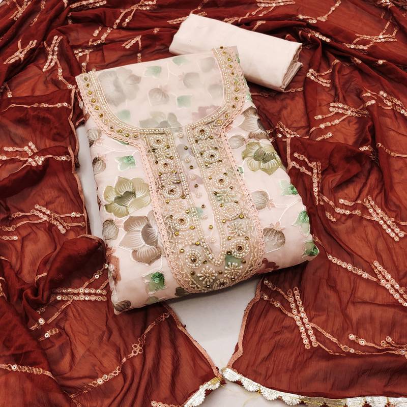 Peach organza embroidered dress material unstitched