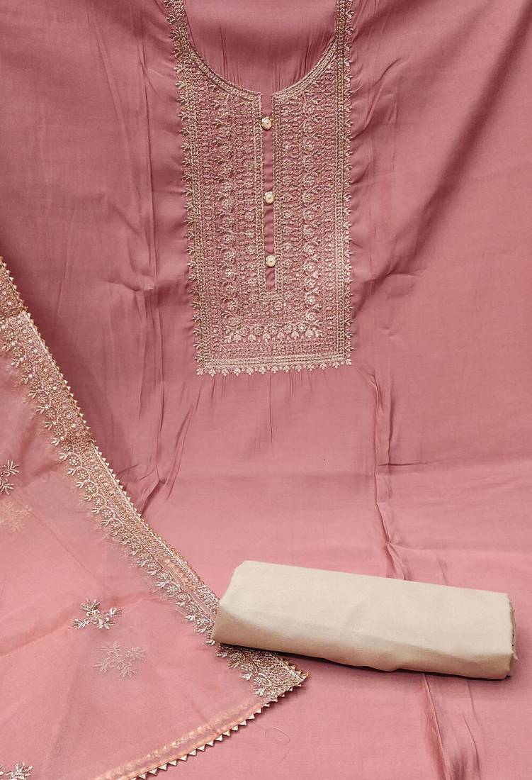 Peach silk blend embroidered dress material unstitched
