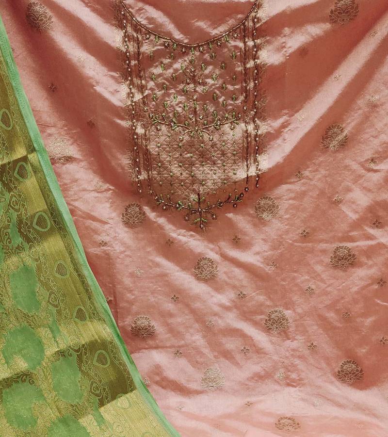Peach banarasi hand embroidery dress material unstitched