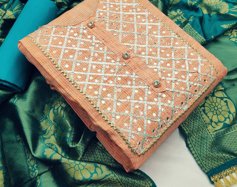 | Product Description | Charming Fancy Hand Work With Banarasi Jacquard Dupatta Straight Style 2.00 Mtr Unstitched Dress Material Top Of Peach Colour Cotton Fabric Suggestable Quarter Style Sleeves And Round Style Neck Also Including 2.10 Mtr Chudidar Style Bottom Piece Material Of Sky Blye Colour Santoon Fabric With 2.00 Mtr Dupatta Of Sky Blye Colour Banarasi Jacquard Fabric |