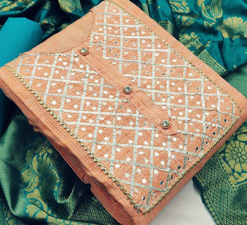Peach cotton hand embroidery dress material unstitched