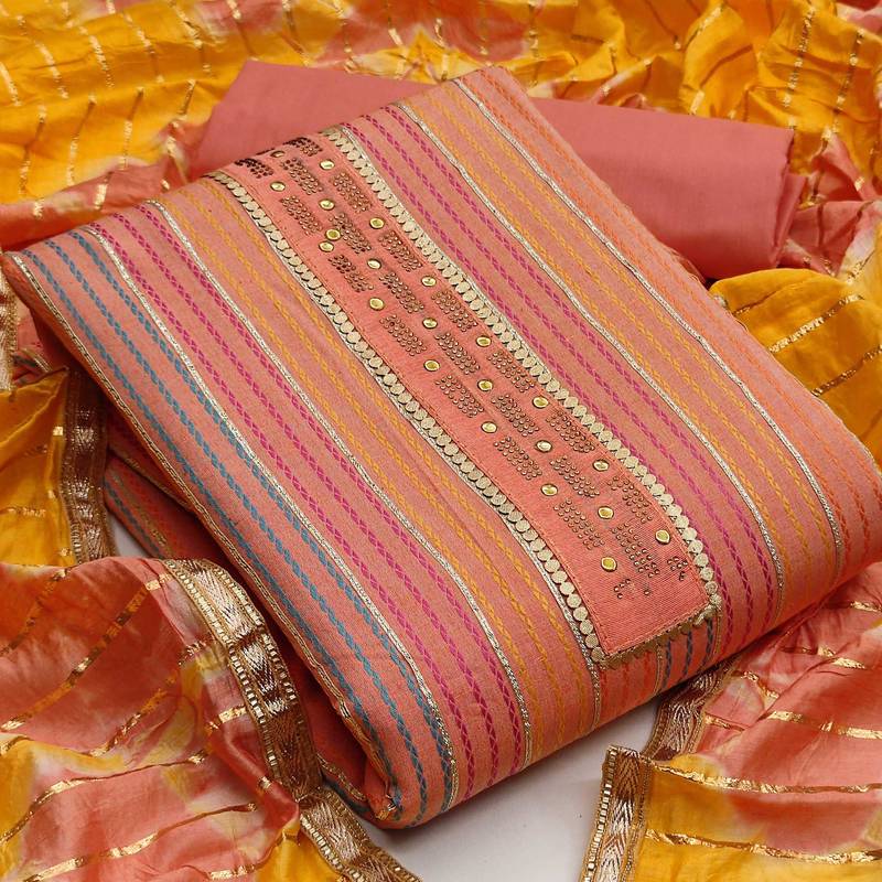 | Product Description | Fancy Hand Work With Dupatta Straight Style 2.00 Mtr Unstitched Dress Material Top Of Peach Colour Cotton Fabric Suggestable Quarter Style Sleeves And Round Style Neck Also Including 2.10 Mtr Chudidar Style Bottom Piece Material Of Peach Colour Cotton Fabric With 2.00 Mtr Dupatta Of Multi Colour Colour Banarasi Fabric |