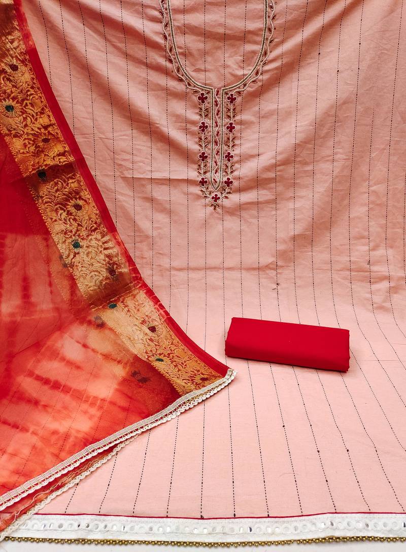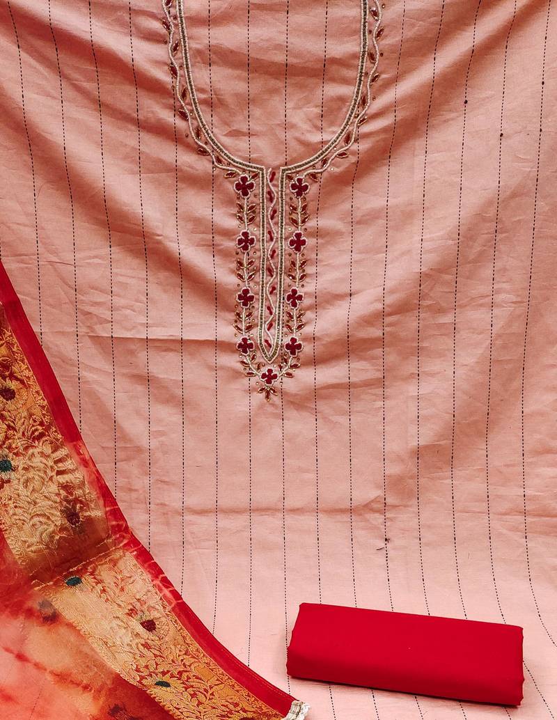 Peach cotton hand embroidery dress material unstitched