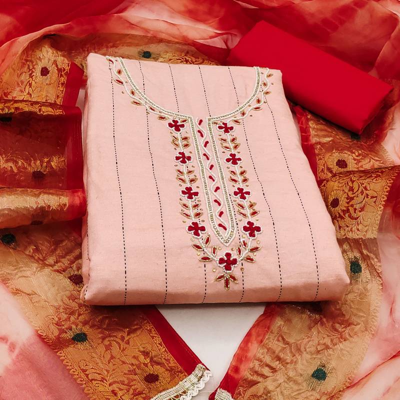| Product Description | Fancy Hand Work And Weaving With Fancy Printed Dupatta Straight Style 2.00 Mtr Unstitched Dress Material Top Of Peach Colour Cemric Cotton Fabric With 2 Mtr Pure Cotton As Lining Inner Fabric Also Including 2.50 Mtr Unstitched Bottom Material Of Red Colour Pure Cotton Fabric With 2.05 Mtr Dupatta Of Red Colour Organza Fabric |