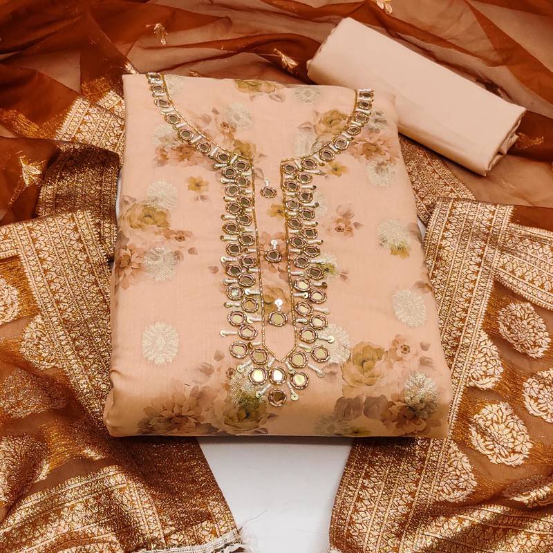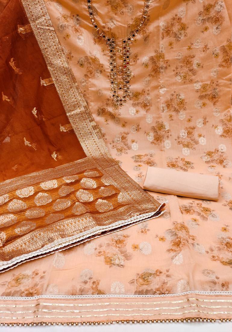 | Product Description | Digital Print And Fancy Weaving And Mirror Work With Banarasi Woven Work Dupatta Straight Style 1.95 Mtr Unstitched Dress Material Top Of Peach Colour Cotton Jacquard Fabric With 2 Mtr Heavy Santoon As Lining Inner Fabric Also Including 3.80 Mtr Unstitched Bottom Material Of Peach Colour Heavy Santoon Fabric With 2.05 Mtr Dupatta Of Rust Colour Organza Jacquard Fabric |
