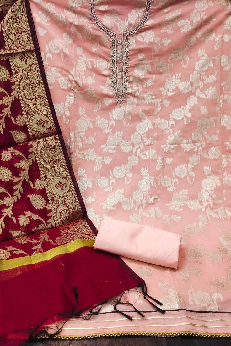 | Product Description | Handwork Neck And Weaving With Fancy Border Straight Style 2.00 Mtr Unstitched Dress Material Top Of Peach Colour Banarasi Jacquard Fabric With 2 Mtr Santoon As Lining Inner Fabric Also Including 2.10 Mtr Unstitched Bottom Material Of Peach Colour Santoon Fabric With 2.00 Mtr Dupatta Of Maroon Colour Banarasi Jacquard Fabric |