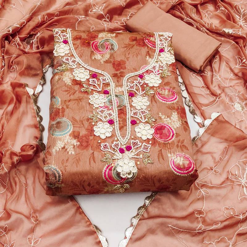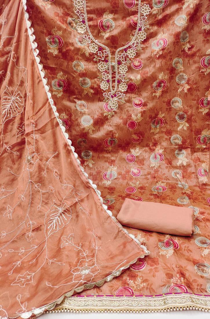 | Product Description | Weaving Handwork And Fancy Border With Embroidered Dupatta Straight Style 2.00 Mtr Unstitched Dress Material Top Of Peach Colour Modal Banarasi Jacquard Fabric With 2 Mtr Santoon As Lining Inner Fabric Also Including 3.80 Mtr Unstitched Bottom Material Of Peach Colour Santoon Fabric With 2.00 Mtr Dupatta Of Peach Colour Nazneen Fabric |