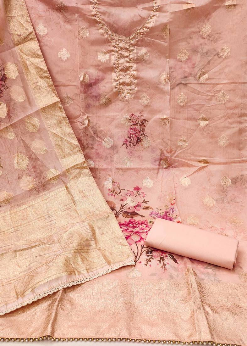 Peach organza woven dress material unstitched