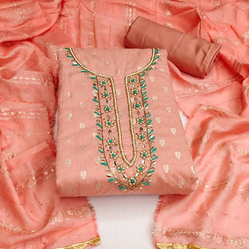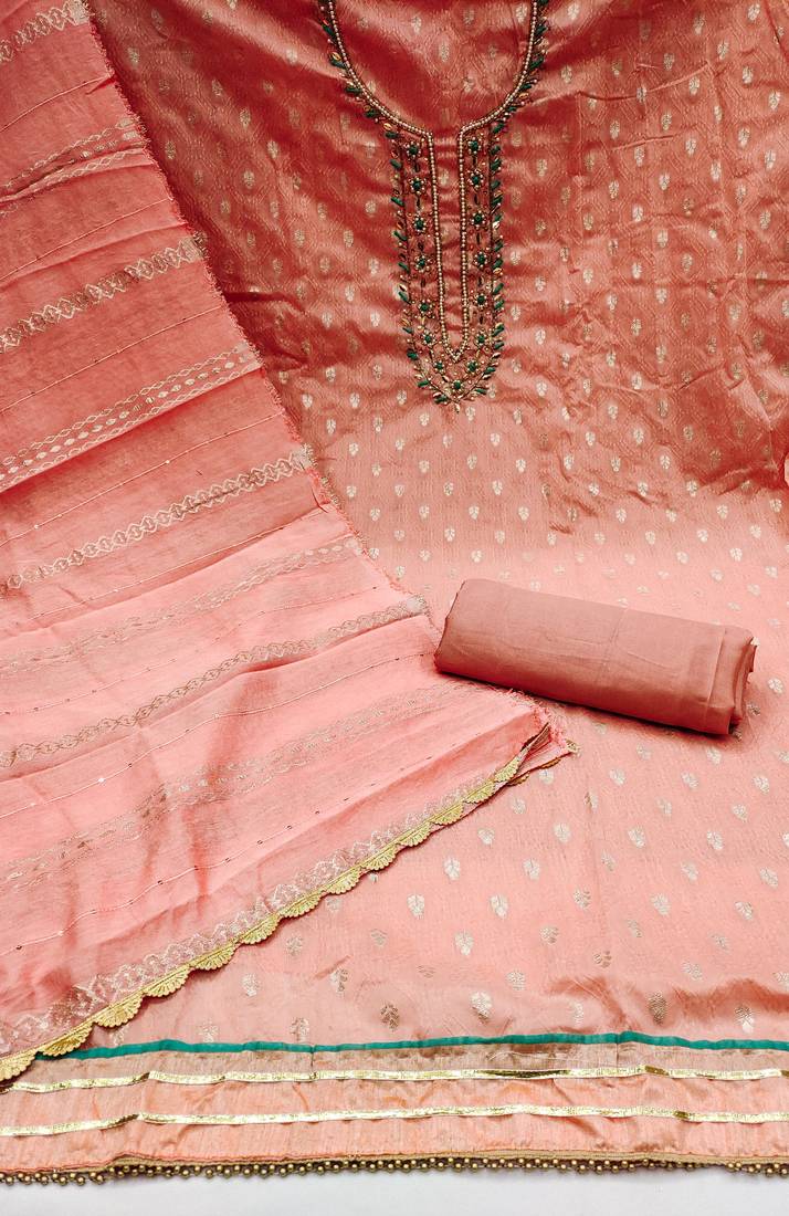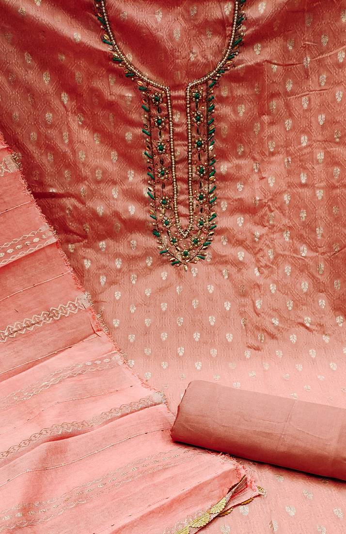| Product Description | Weaving Work With Heavy Hand Work On Neck Along With Woven Work Dupatta Straight Style 2.00 Mtr Unstitched Dress Material Top Of Peach Colour Jacquard Silk Fabric With 2 Mtr Heavy Santoon As Lining Inner Fabric Also Including 2.40 Mtr Unstitched Bottom Material Of Peach Colour Heavy Santoon Fabric With 2.20 Mtr Dupatta Of Peach Colour Soft Cotton Fabric |