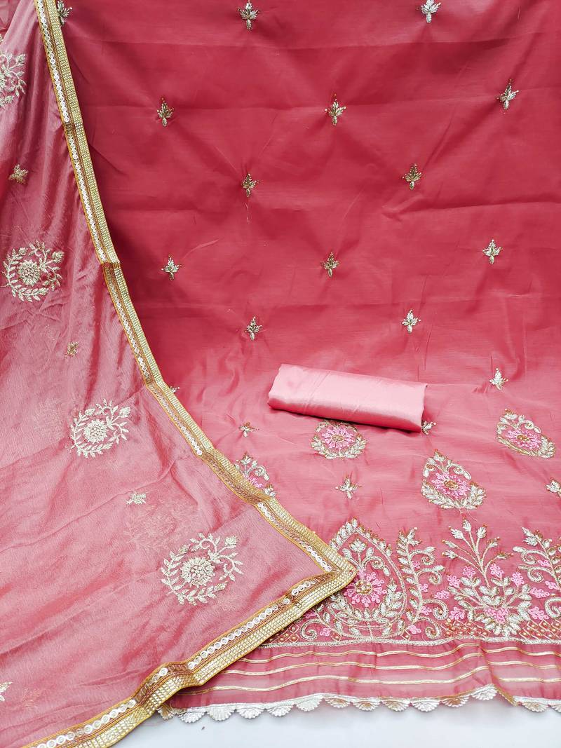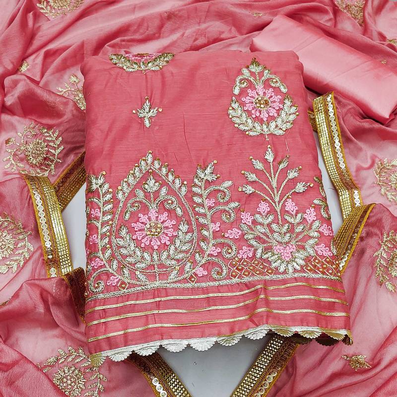 Pink chanderi embroidered dress material unstitched