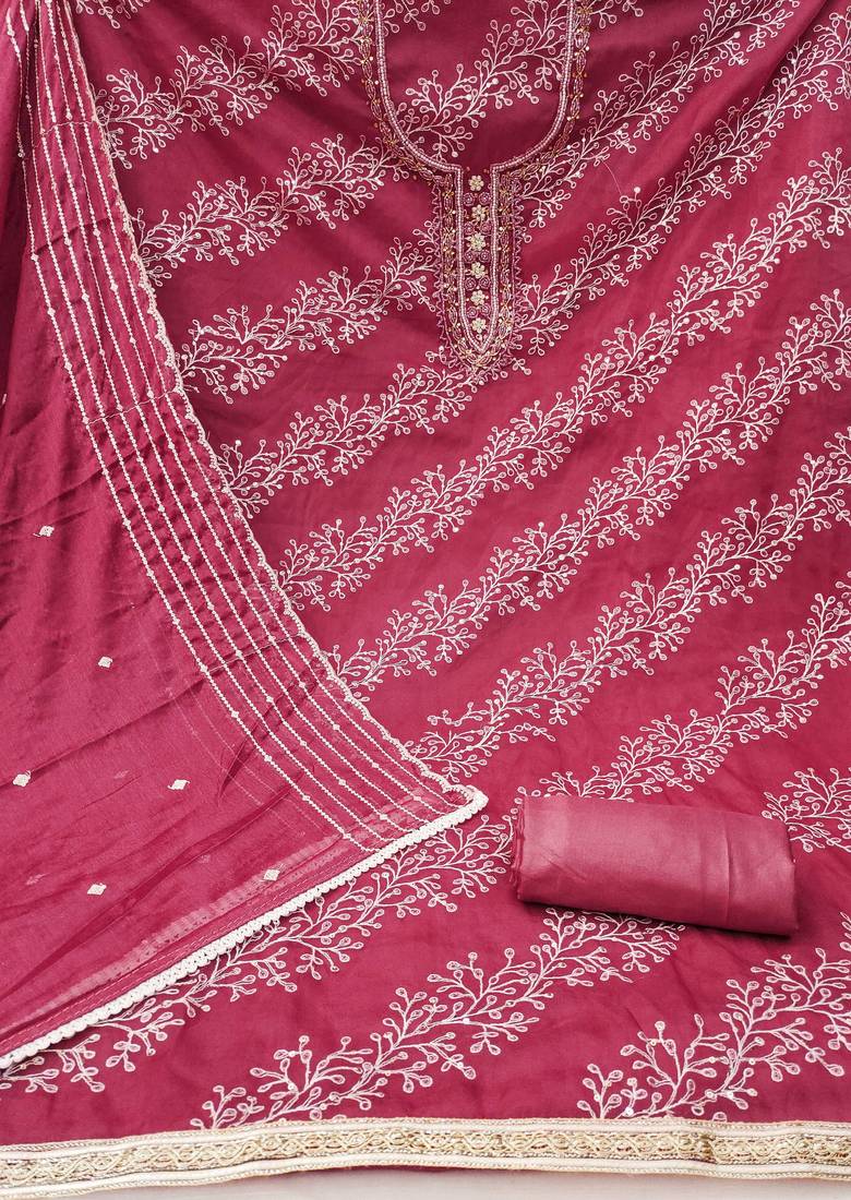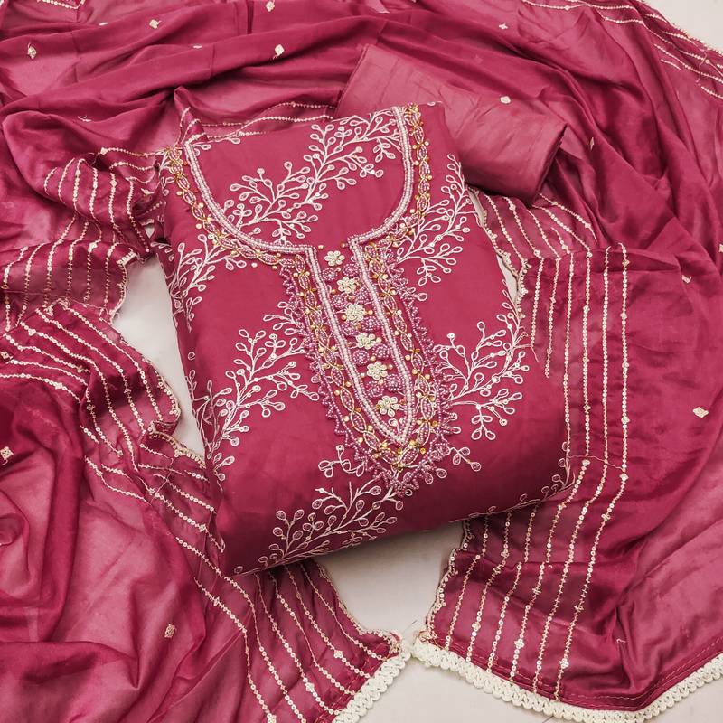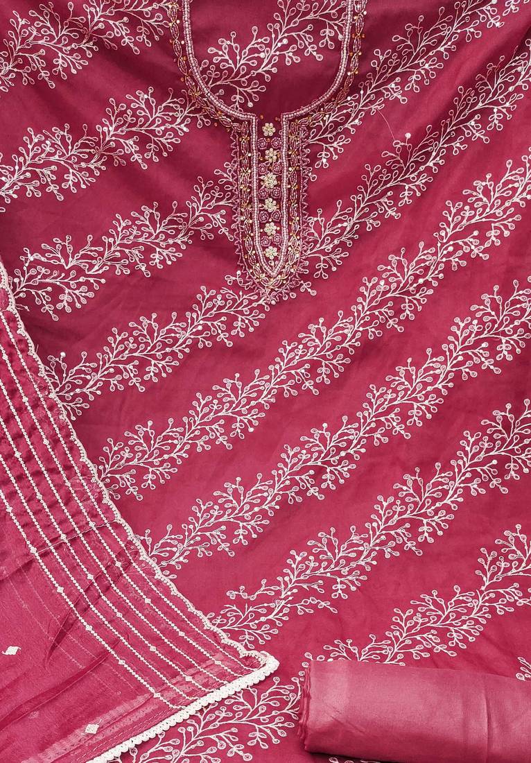 Pink organza embroidered dress material unstitched