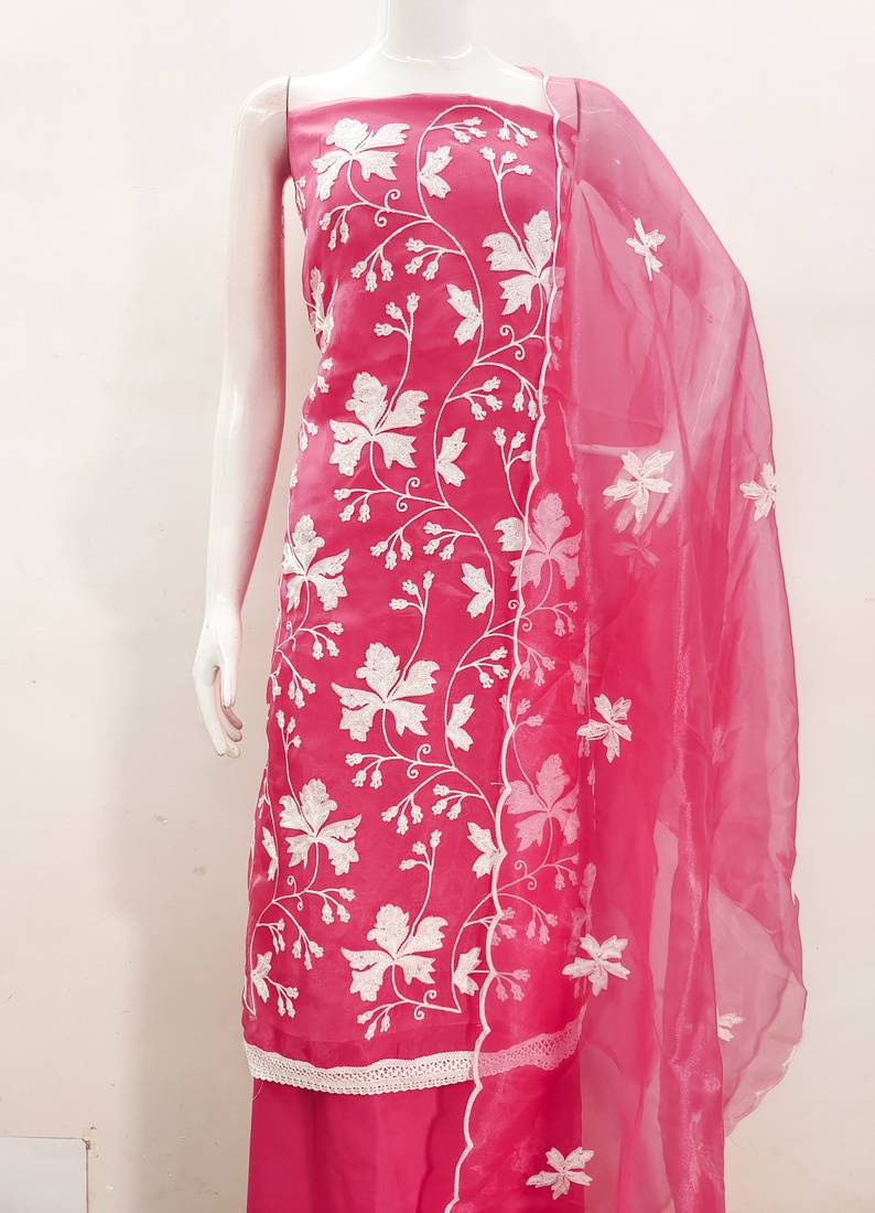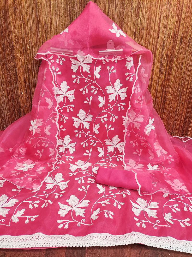 Pink organza embroidered dress material unstitched