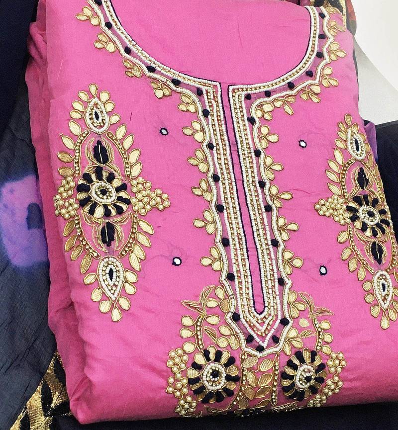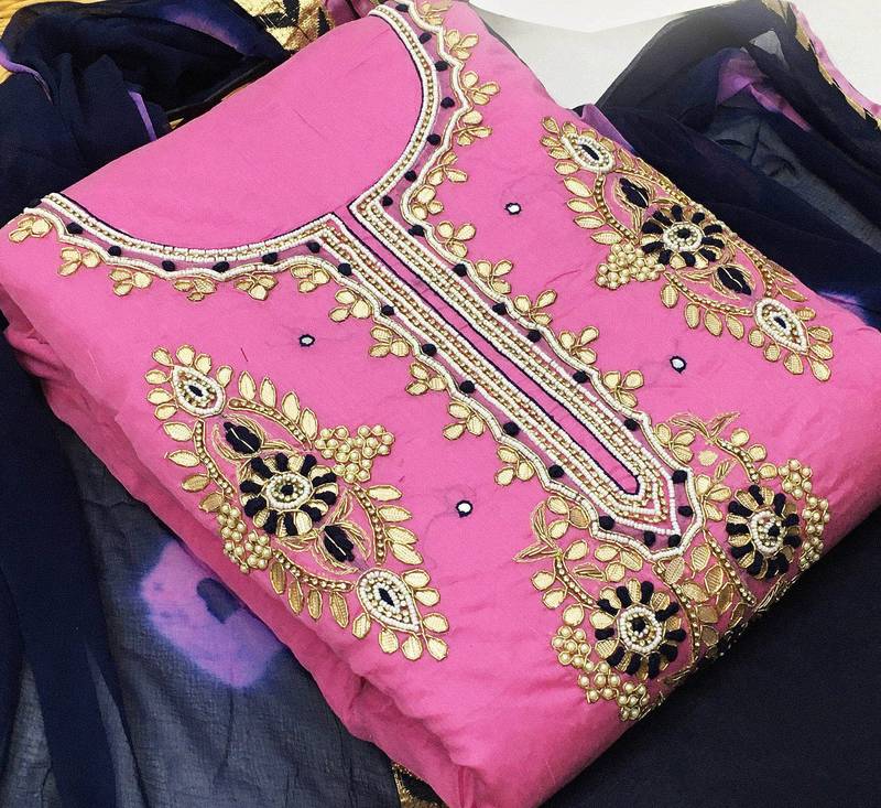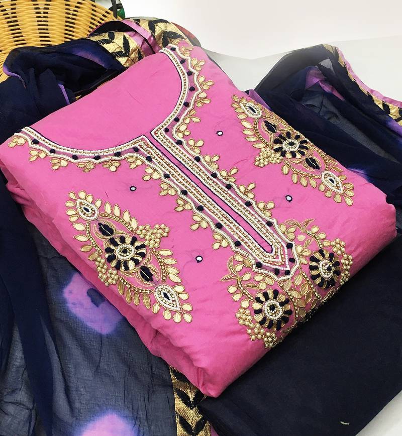 Pink chanderi hand embroidery dress material unstitched