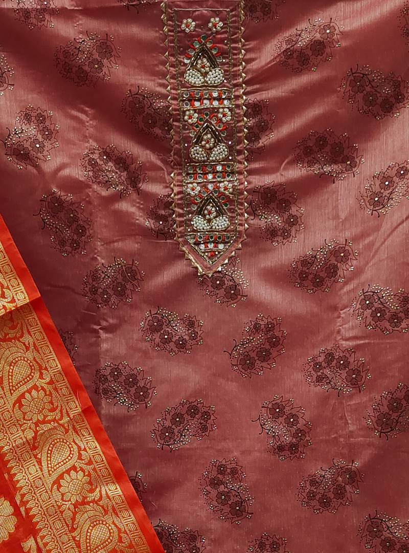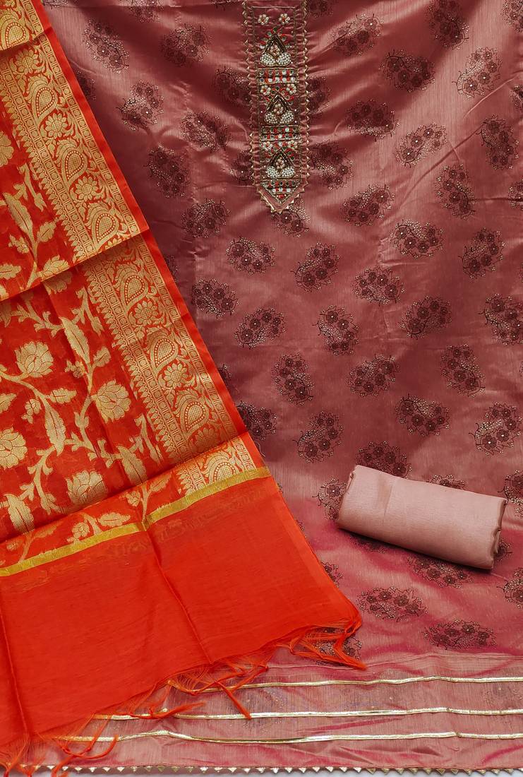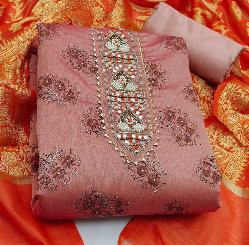 | Product Description | Heavy Handwork And Fancy Border With Weaving Dupatta Straight Style 1.80 Mtr Unstitched Dress Material Top Of Pink Colour Modal Chanderi Cotton Fabric Suggestable Quarter Style Sleeves And Round Style Neck Also Including 2.00 Mtr Chudidar Style Bottom Material Of Pink Colour Santoon Fabric With 2.00 Mtr Dupatta Of Orange Colour Banarasi Jacquard Fabric |