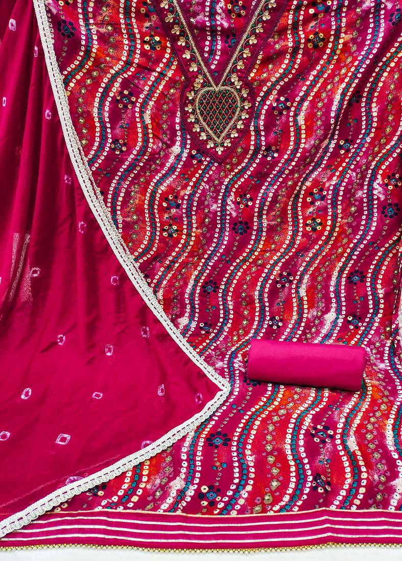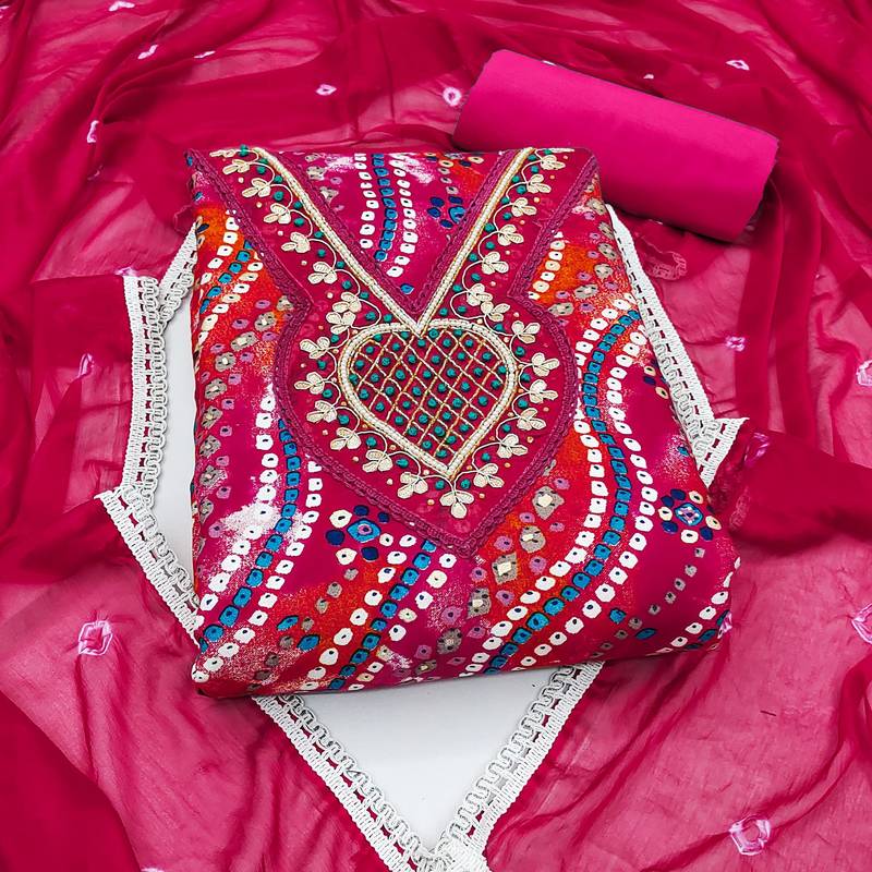 | Product Description | Lahariya Print Handwork And Fancy Border With Printed Dupatta Straight Style 1.90 Mtr Unstitched Dress Material Top Of Pink Colour Jam Coton Fabric Also Including 2.10 Mtr Chudidar Style Bottom Piece Material Of Pink Colour Cotton Fabric With 2.00 Mtr Dupatta Of Pink Colour Nazneen Fabric |