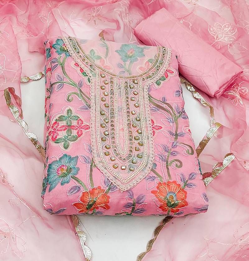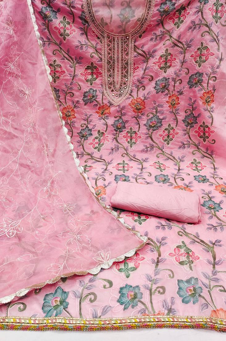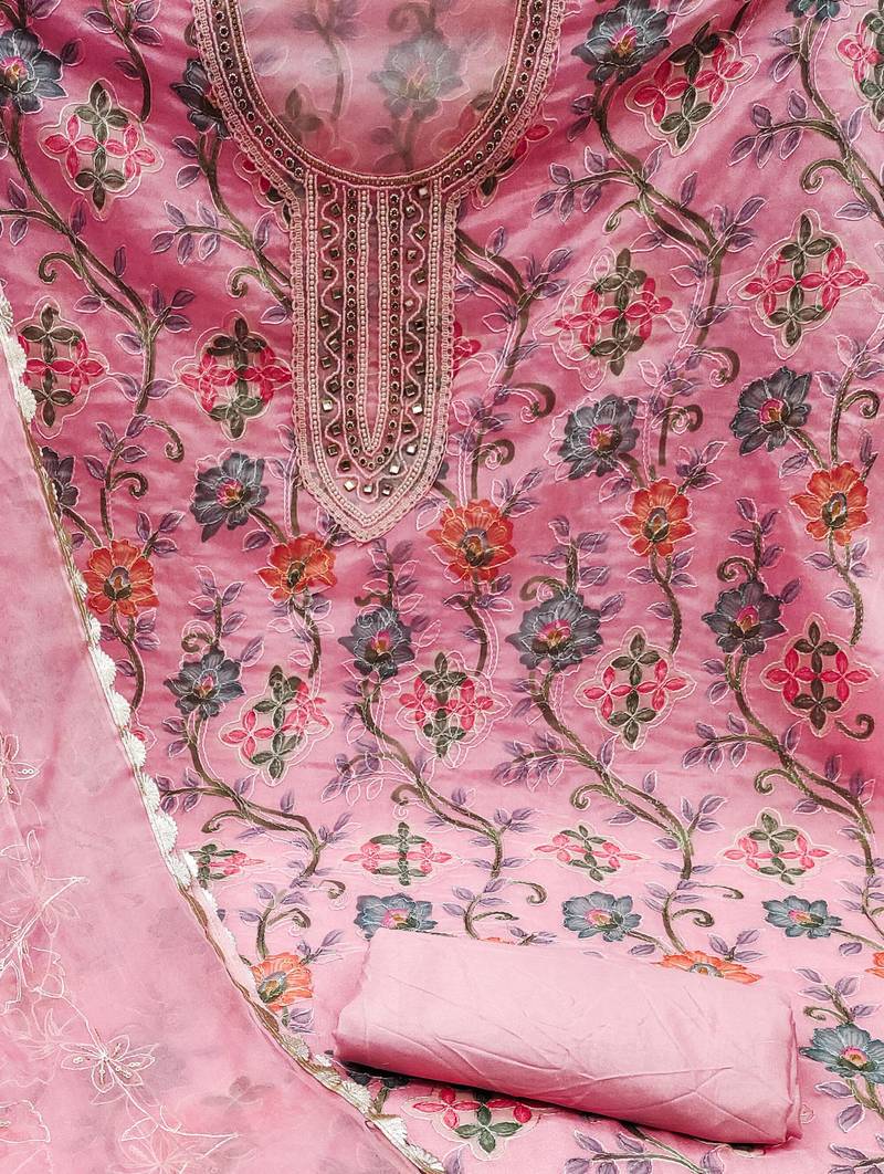 Pink organza hand embroidery dress material unstitched