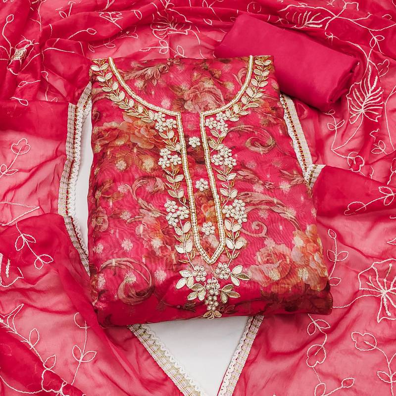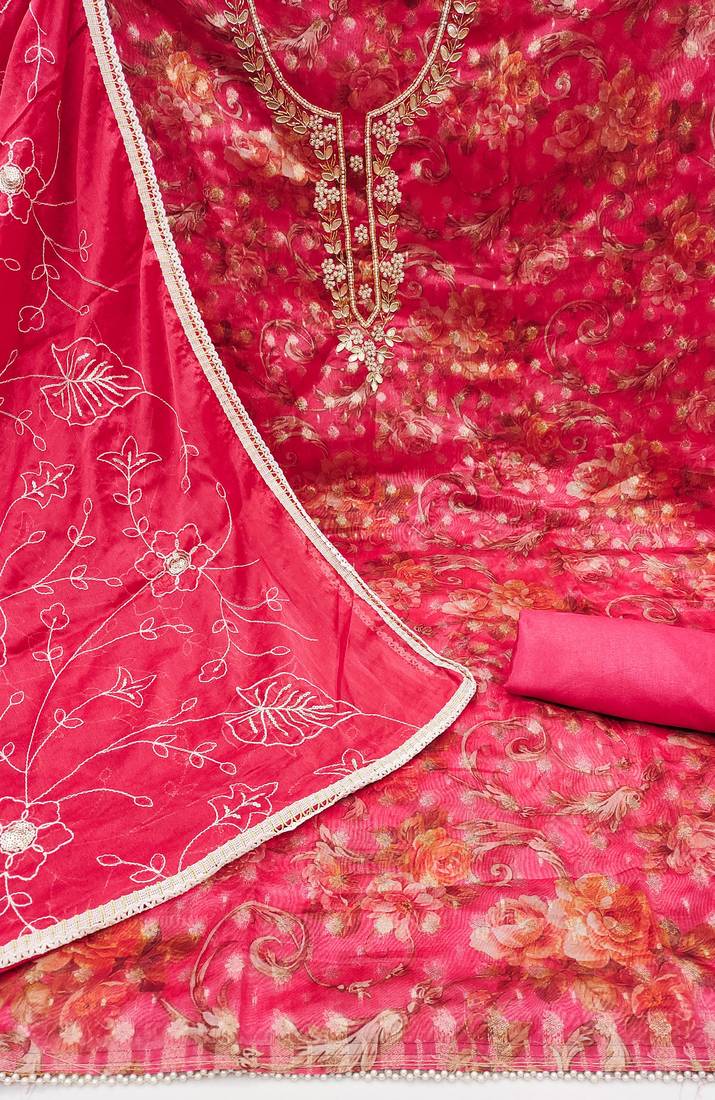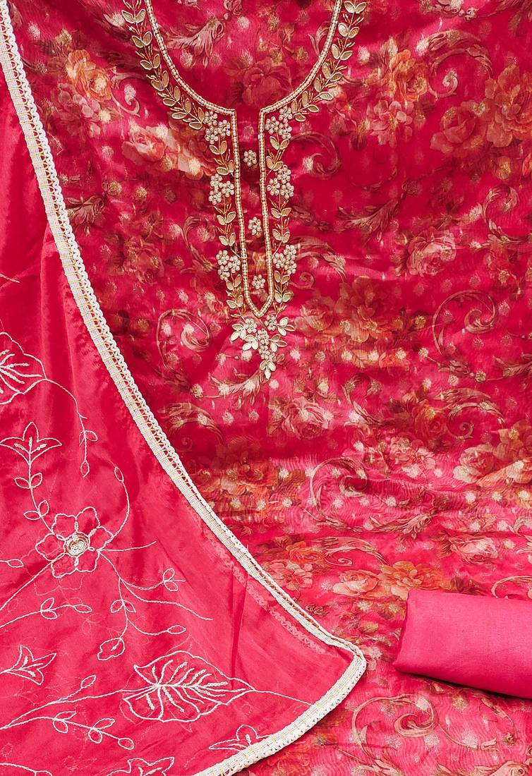 Pink organza hand embroidery dress material unstitched