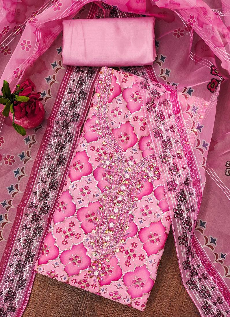 | Product Description | Sequin Work With Position Print And Hand Work With Heavy Digital Print Along Embroidery Dupatta Work Straight Style 2.00 Mtr Unstitched Dress Material Top Of Pink Colour Organza Fabric With 2 Mtr Heavy Santoon As Lining Inner Fabric Also Including 4.00 Mtr Unstitched Bottom Material Of Pink Colour Heavy Santoon Fabric With 2.25 Mtr Dupatta Of Pink Colour Organza Fabric |