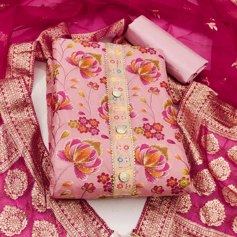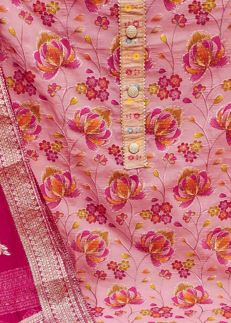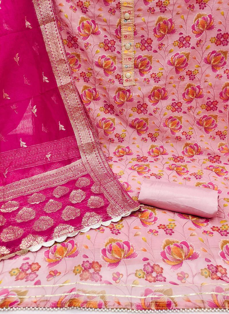 | Product Description | Heavy Sequin And Fancy Position Print Work And Weaving Work Dupatta Straight Style 1.95 Mtr Unstitched Dress Material Top Of Pink Colour Organza Fabric With 2 Mtr Heavy Santoon As Lining Inner Fabric Also Including 3.80 Mtr Unstitched Bottom Material Of Pink Colour Heavy Santoon Fabric With 2.05 Mtr Dupatta Of Pink Colour Banarasi Jacquard Fabric |