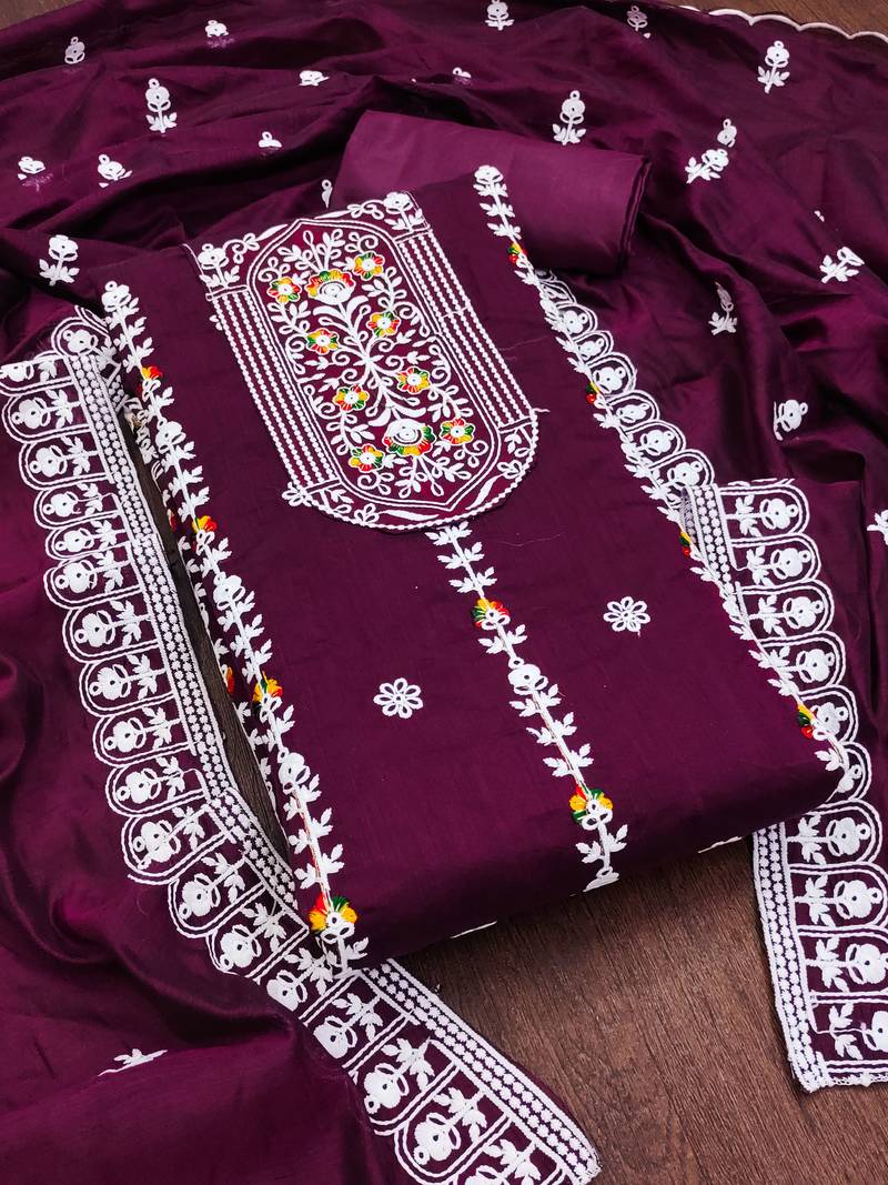 Purple cotton embroidered dress material unstitched