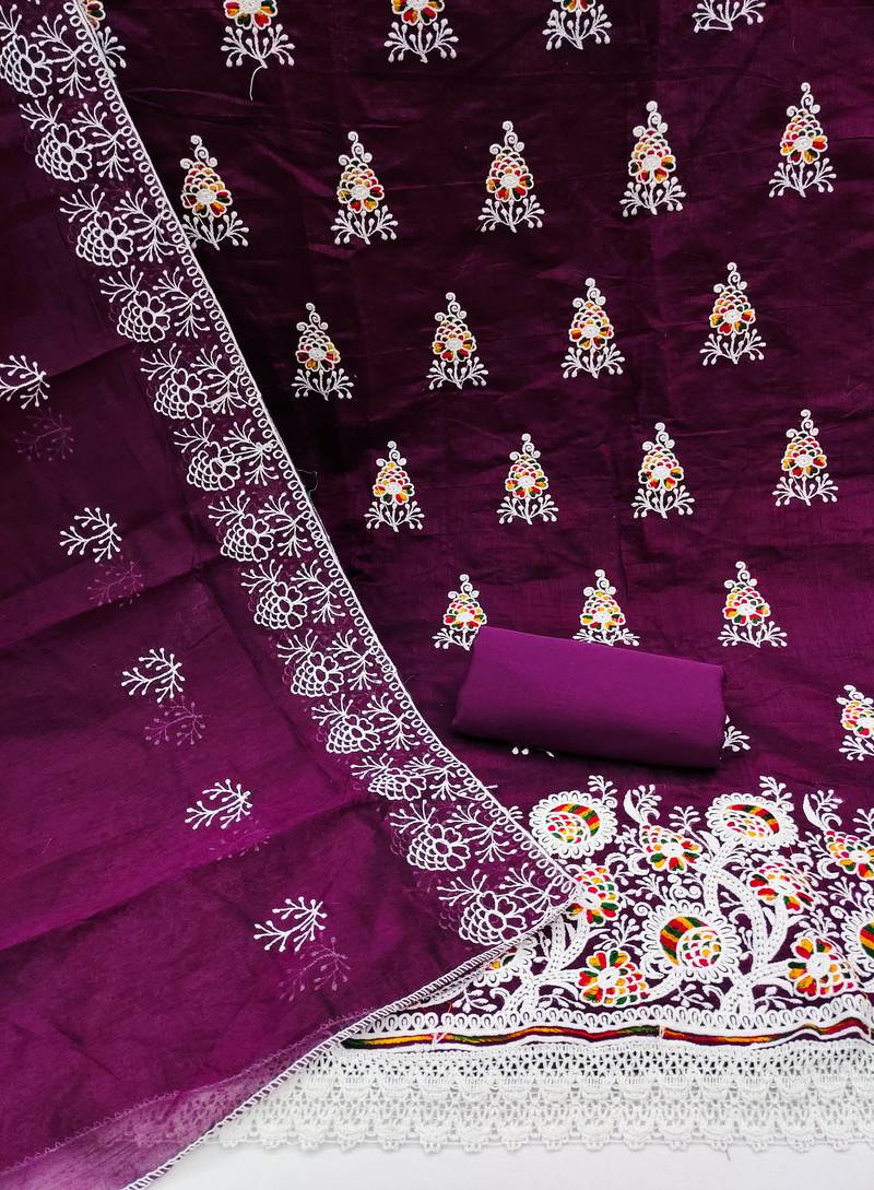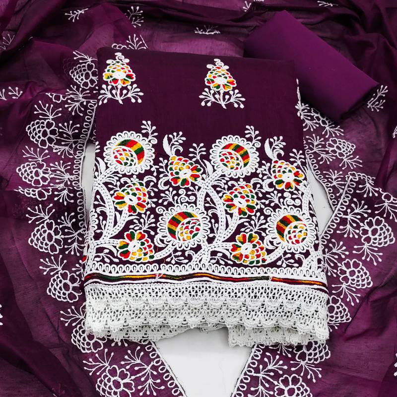 Purple cotton embroidered dress material unstitched