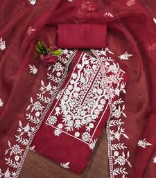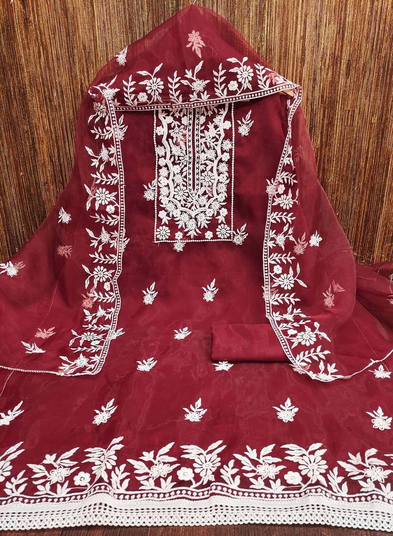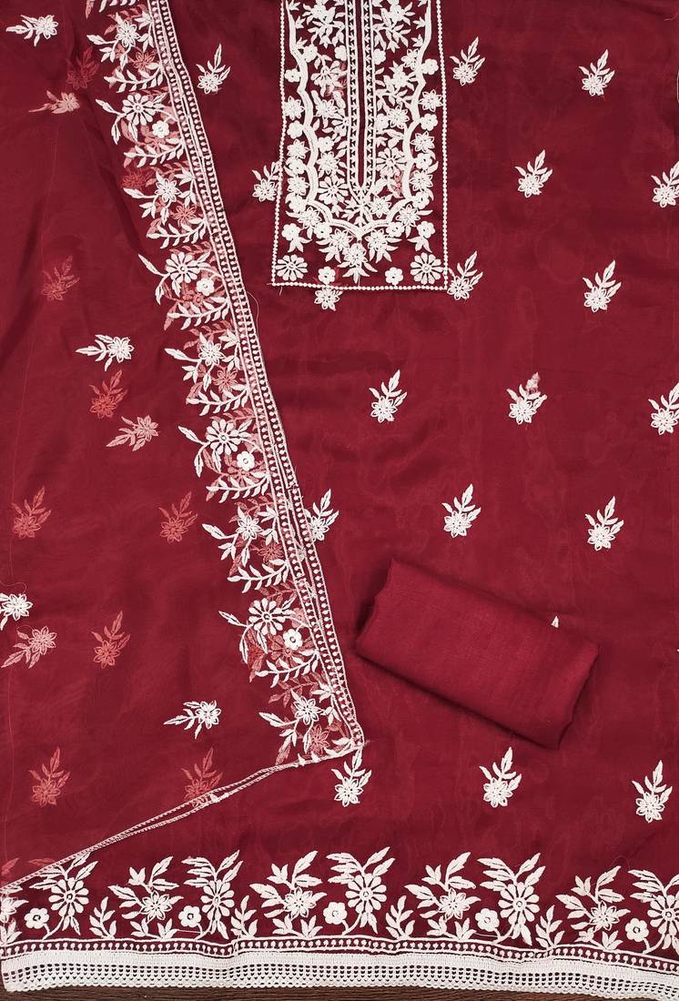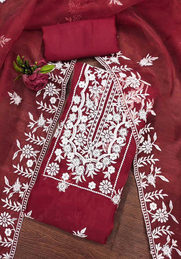 Red organza embroidered dress material unstitched