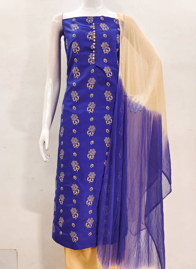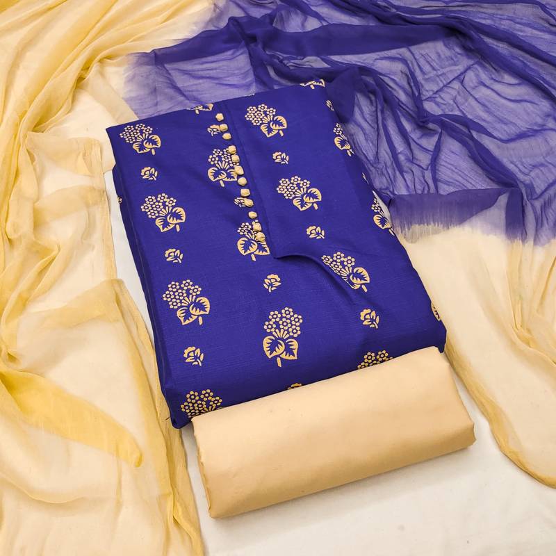 | Product Description | Printed Top With Fancy Saburi Print Dupatta Straight Style 1.80 Mtr Unstitched Dress Material Top Of Royal Blue Colour Cotton Slub Fabric Also Including 2.00 Mtr Chudidar Style Bottom Piece Material Of Beige Colour Cotton Fabric With 2.00 Mtr Dupatta Of Multi Colour Nazneen Fabric |
