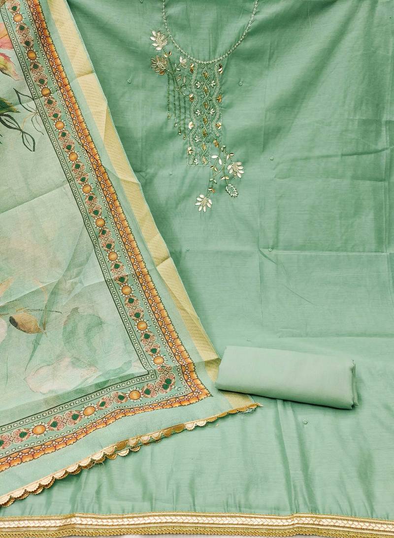Sea green cotton embroidered dress material unstitched