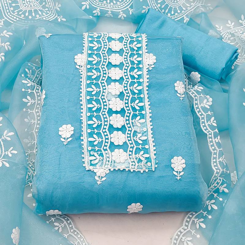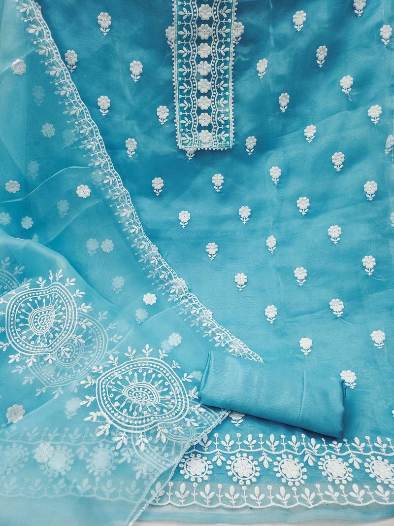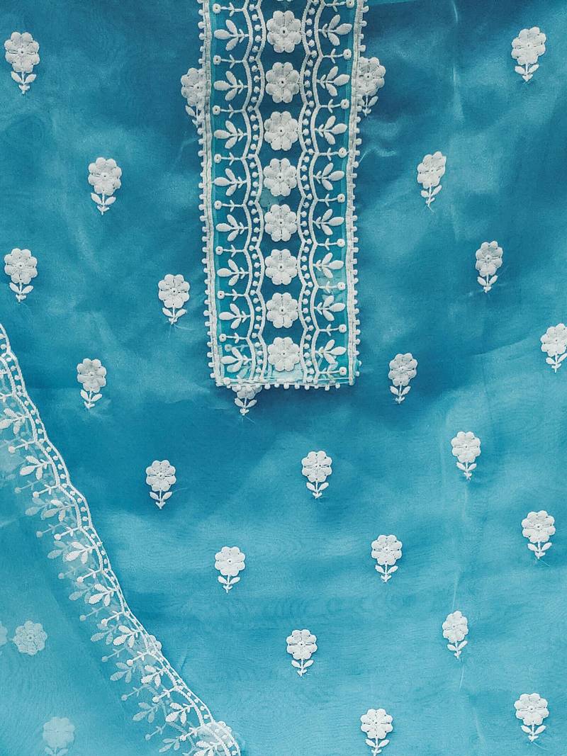 Sea green organza embroidered dress material unstitched