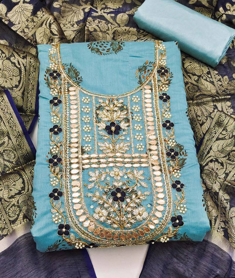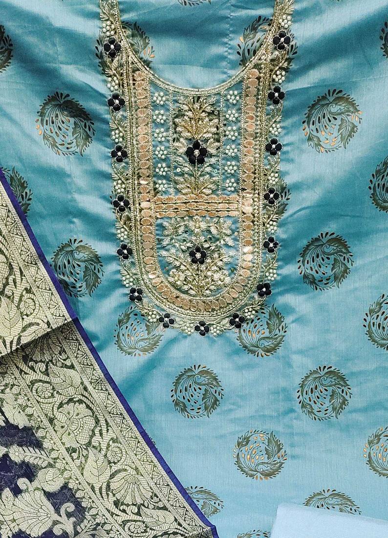 | Product Description | Simplistic Heavy Handwork And Fancy Border With Banarasi Weaving Dupatta Straight Style 1.90 Mtr Unstitched Dress Material Top Of Sea Green Colour Modal Cotton Fabric With 2 Mtr Santoon As Lining Inner Fabric Also Including 2.10 Mtr Unstitched Bottom Material Of Sea Green Colour Santoon Fabric With 2.00 Mtr Dupatta Of Blue Colour Banarasi Jacquard Fabric |