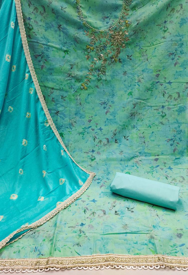 | Product Description | Print Handwork And Fancy Border With Bandhani Print Dupatta Straight Style 2.00 Mtr Unstitched Dress Material Top Of Sea Green Colour Cembric Cotton Fabric Also Including 2.40 Mtr Chudidar Style Bottom Piece Material Of Sky Blue Colour Pure Cotton Fabric With 2.05 Mtr Dupatta Of Sky Blue Colour Nazneen Fabric |