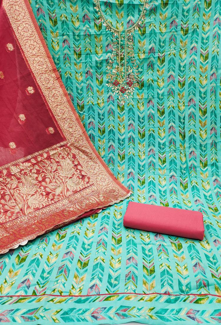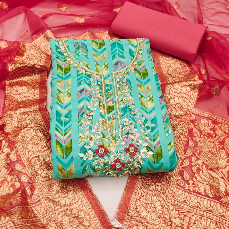 | Product Description | Fancy Digital Print Handwork And Fancy Border With Banarasi Dupatta Straight Style 2.00 Mtr Unstitched Dress Material Top Of Sea Green Colour Jam Coton Fabric Also Including 2.10 Mtr Chudidar Style Bottom Piece Material Of Pink Colour Cotton Fabric With 2.00 Mtr Dupatta Of Pink Colour Soft Organza Banarasi Fabric |
