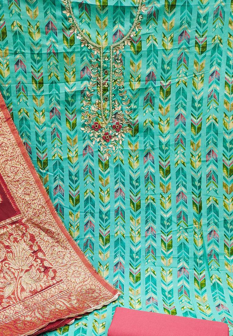 Sea green cotton hand embroidery dress material unstitched