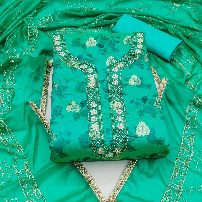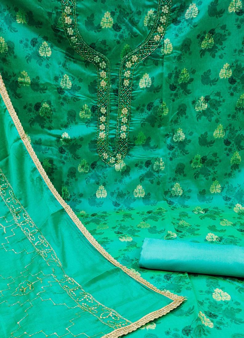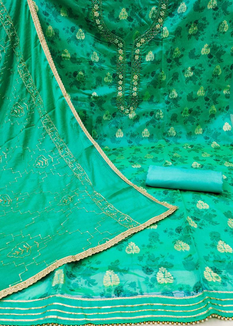 | Product Description | Digital Print And Fancy Weaving And Hand Work With Embroidered Dupatta Straight Style 1.85 Mtr Unstitched Dress Material Top Of Sea Green Colour Modal Cotton Jacquard Fabric With 2 Mtr Santoon As Lining Inner Fabric Also Including 3.70 Mtr Unstitched Bottom Material Of Sea Green Colour Santoon Fabric With 2.00 Mtr Dupatta Of Sea Green Colour Organza Fabric |