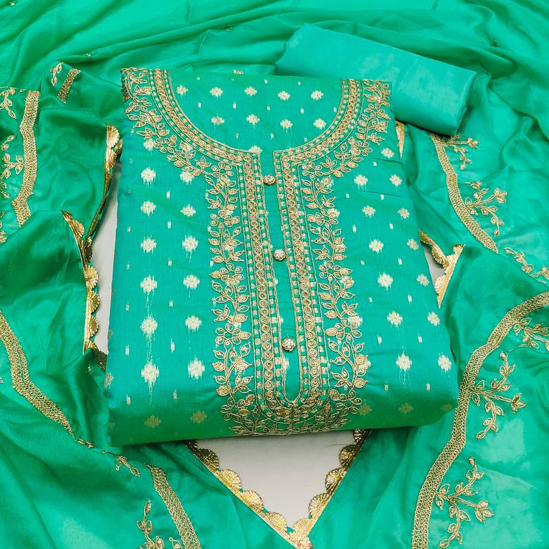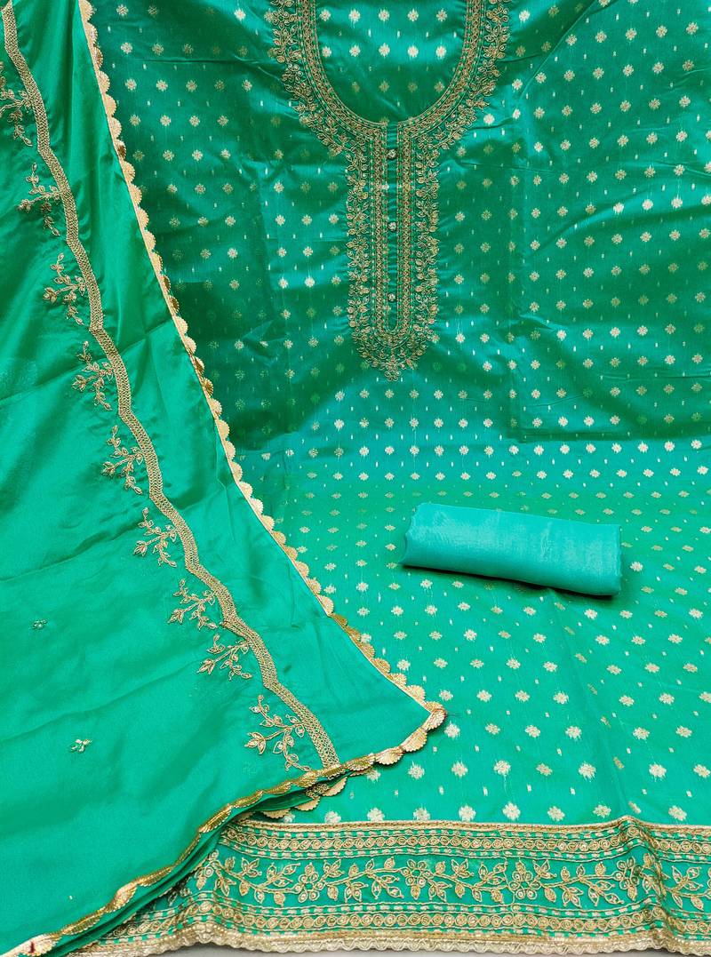 | Product Description | Weaving Fancy Handwork And Heavy Border With Dupatta Straight Style 2.00 Mtr Unstitched Dress Material Top Of Sea Green Colour Modal Cotton Fabric With 2 Mtr Santoon As Lining Inner Fabric Also Including 3.80 Mtr Unstitched Bottom Material Of Sea Green Colour Santoon Fabric With 2.00 Mtr Dupatta Of Sea Green Colour Nazneen Fabric |