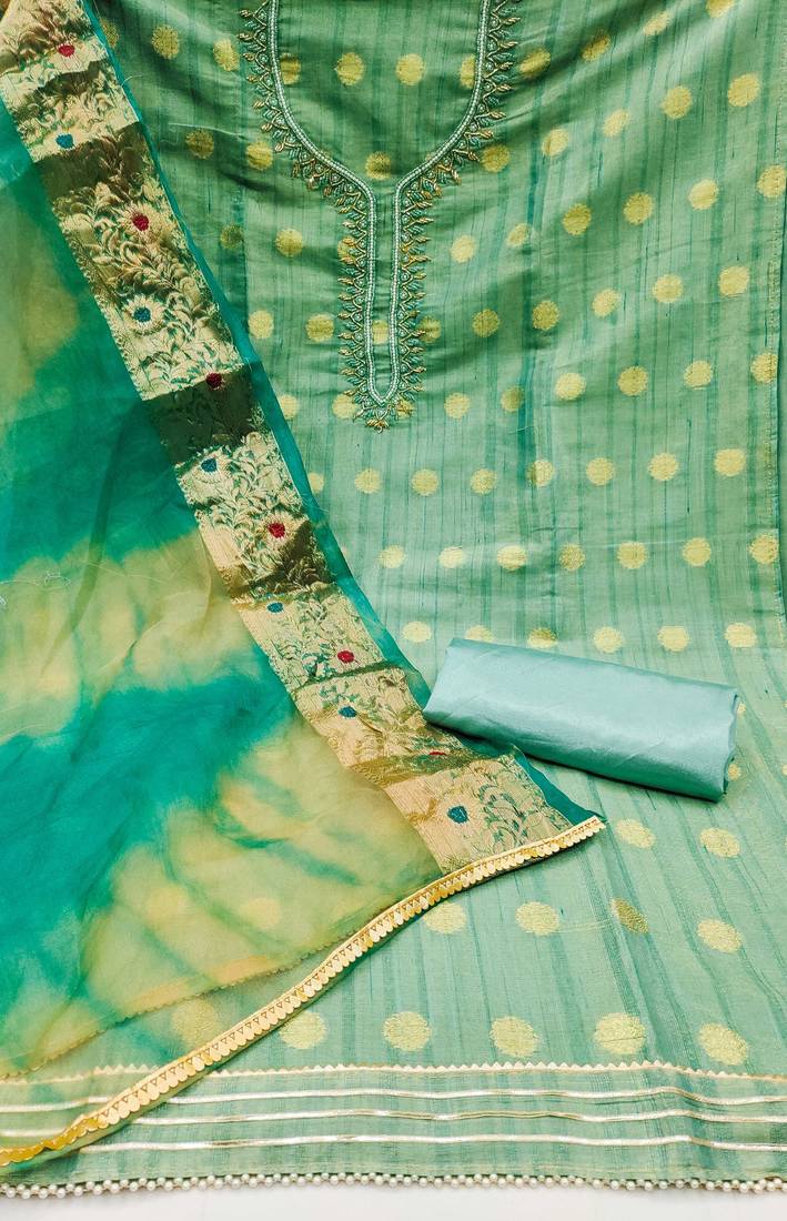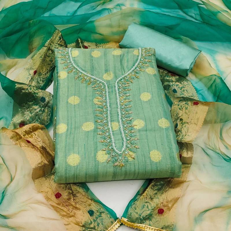 | Product Description | Dashing Fancy Weaving And Border And Hand Work With Organza Woven Dupatta Straight Style 1.85 Mtr Unstitched Dress Material Top Of Sea Green Colour Modal Cotton Jacquard Fabric With 2 Mtr Santoon As Lining Inner Fabric Also Including 3.70 Mtr Unstitched Bottom Material Of Sea Green Colour Santoon Fabric With 2.00 Mtr Dupatta Of Sea Green Colour Organza Banarasi Fabric |