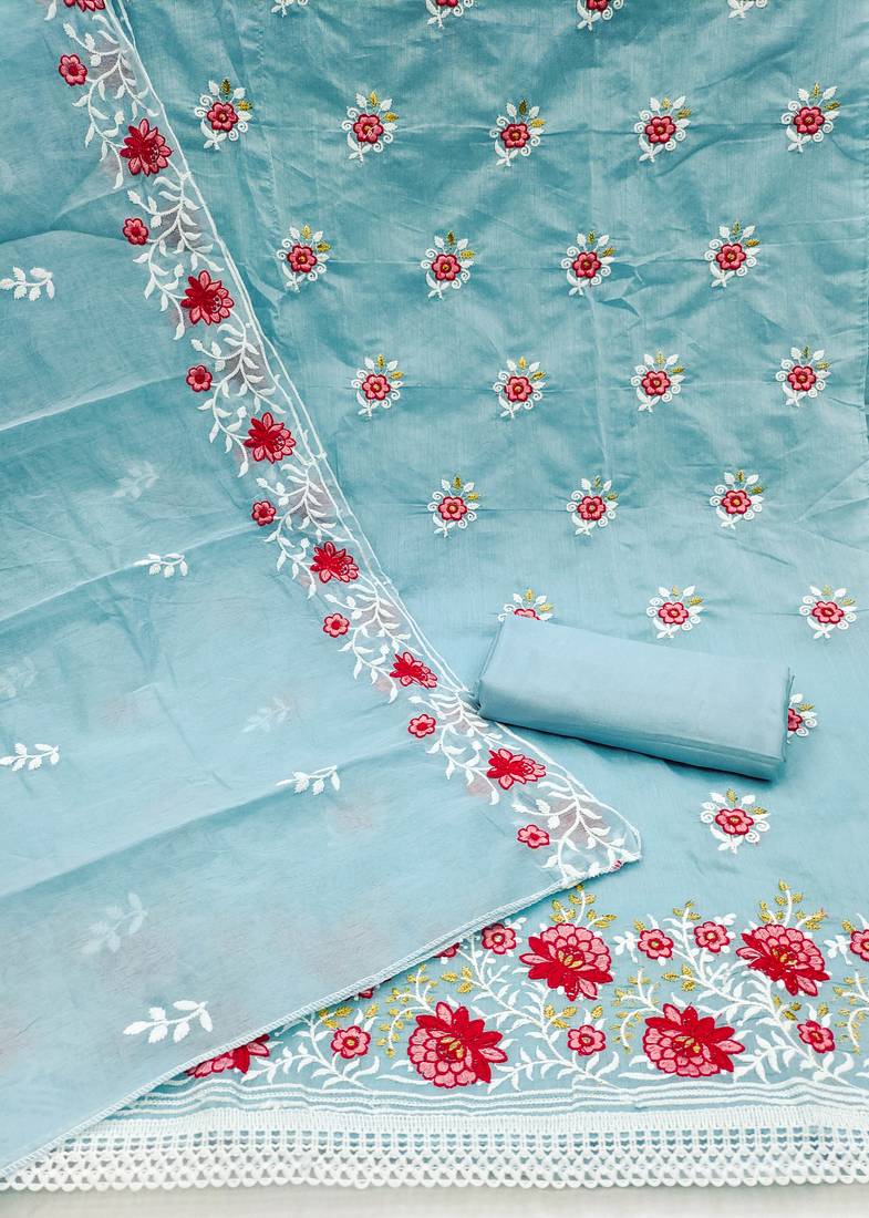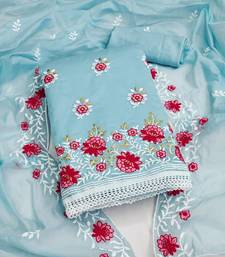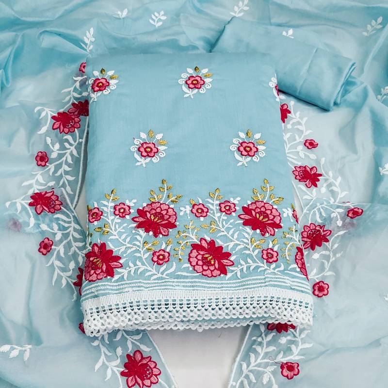 Sky blue cotton embroidered dress material unstitched