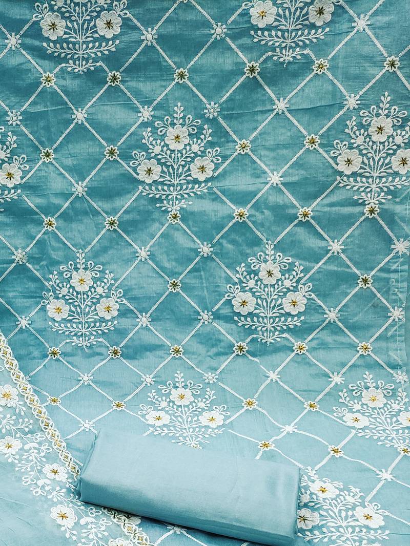 | Product Description | Heavy White Thread Embrodiered And Sequin Work Along With Embrodiered Dupatta Straight Style 2.00 Mtr Unstitched Dress Material Top Of Sky Blue Colour Chanderi Cotton Fabric With 2 Mtr Heavy Santoon As Lining Inner Fabric Also Including 2.40 Mtr Unstitched Bottom Material Of Sky Blue Colour Heavy Santoon Fabric With 2.10 Mtr Dupatta Of Sky Blue Colour Chanderi Cotton Fabric |