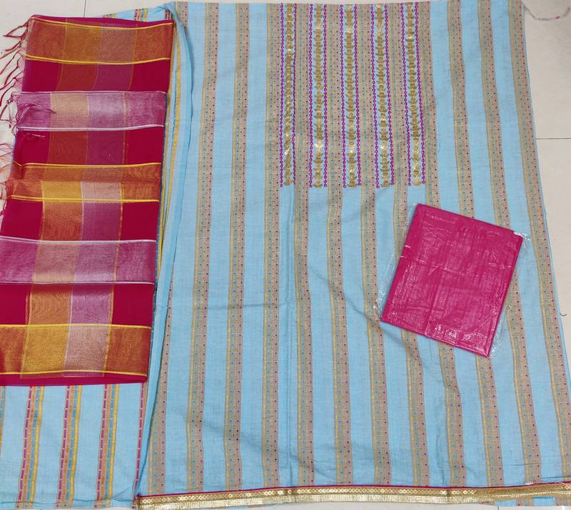 | Product Description | Heavy Hand Work With Dupatta Straight Style 2.00 Mtr Unstitched Dress Material Top Of Sky Blue Colour Cotton Fabric Suggestable Quarter Style Sleeves And Round Style Neck Also Including 2.10 Mtr Chudidar Style Bottom Piece Material Of Pink Colour Cotton Fabric With 2.00 Mtr Dupatta Of Multi Colour Banarasi Jacquard Fabric |