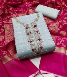 Teal blue jacquard hand embroidery dress material unstitched