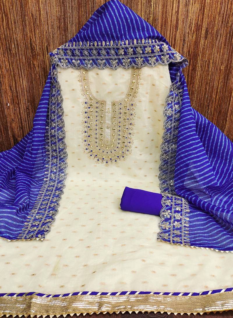 | Product Description | Heavy Embroidered Neck And Fancy Border With Printed Dupatta Straight Style 2.00 Mtr Unstitched Dress Material Top Of White Colour Chanderi Silk Fabric With 2 Mtr Santoon As Lining Inner Fabric Also Including 3.60 Mtr Unstitched Bottom Material Of Blue Colour Santoon Fabric With 2.00 Mtr Dupatta Of Blue Colour Kota Checks Fabric |